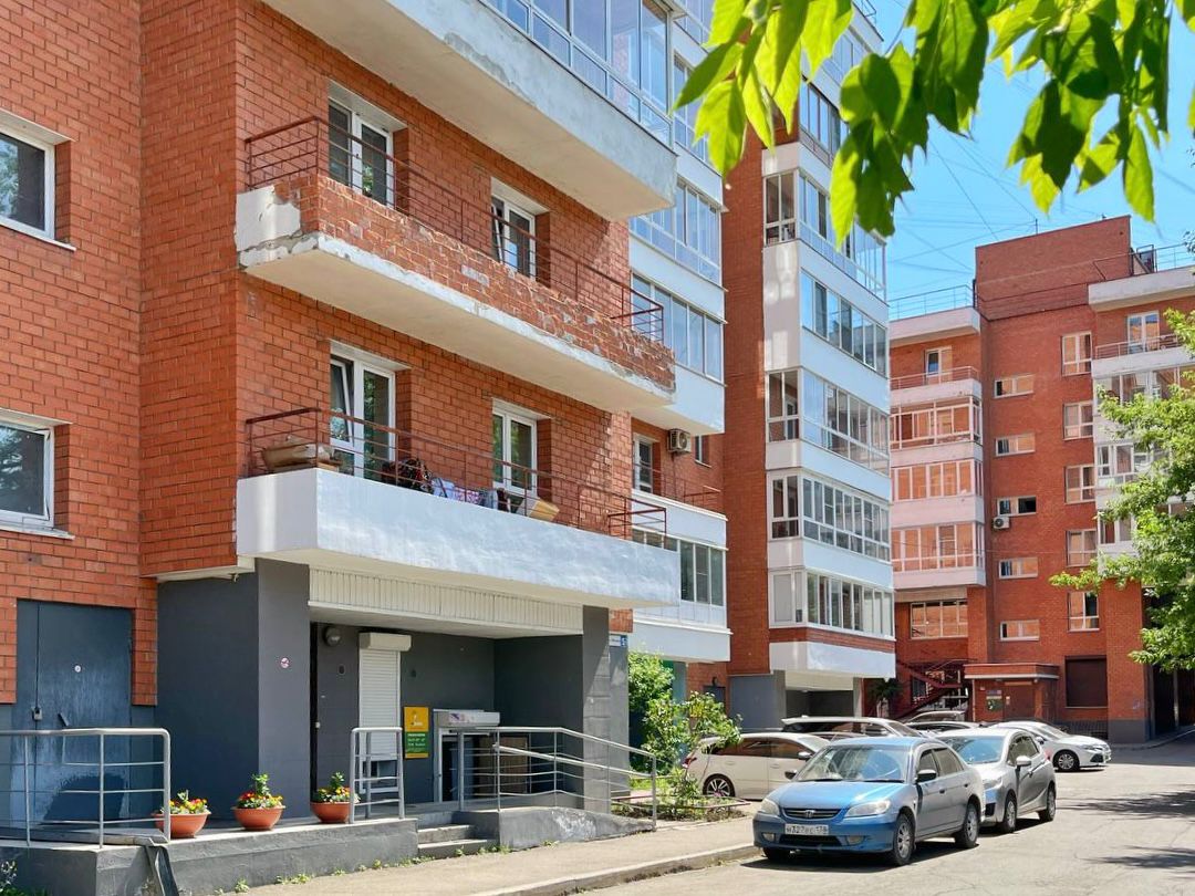 Два выхода на лоджию из спальной комнаты и из кухни-гостиной. Из окон открывается отличный вид на город.